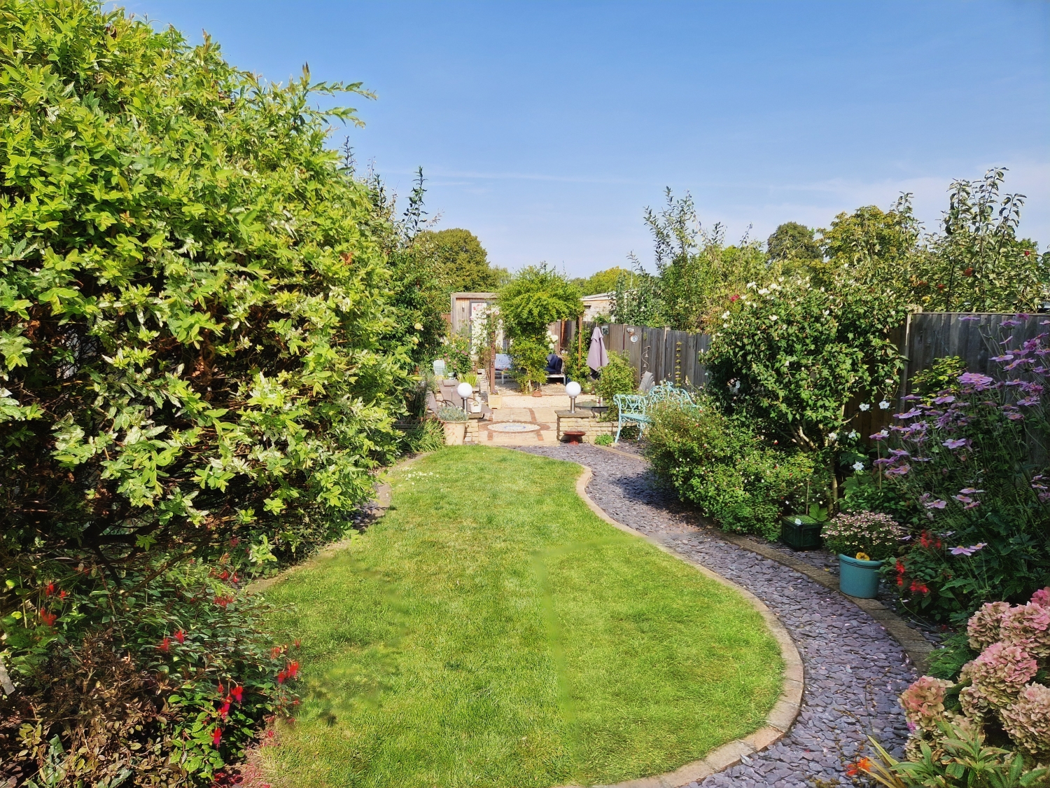 REAR GARDEN: Approximately 100ft (30.48m). patio area with steps down to lawn, side access to front, shingle and lawn area, two security lights and pillar lights, courtyard area with power, outside tap and enclosed by brick and panel fencing, access to playing fields.